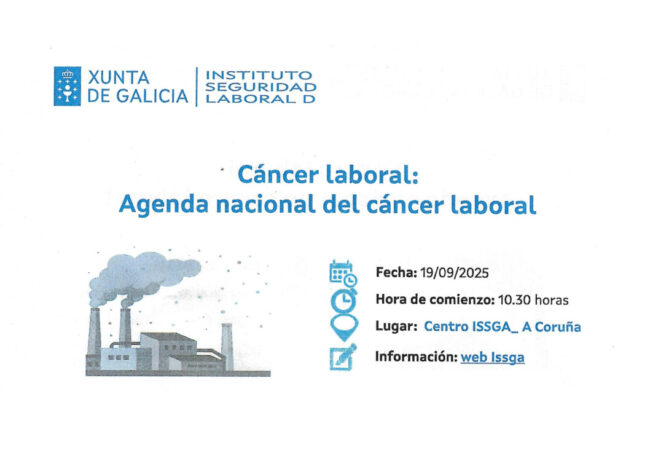 El día 19 de septiembre se celebró en la Coruña, promovido por el ISSGA, una Jornada Técnica en la que se presentó la «Agenda Nacional del cáncer laboral», como base de formación e información acerca de la situación actual, incidencia, diagnósticos más relevantes y los problemas en la declaración de las sospechas de los cánceres…